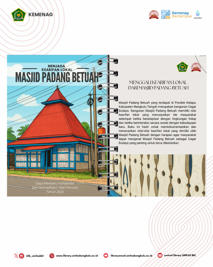 Abstrak: Masjid Padang Betuah yang terdapat di Desa Pondok Kelapa Bengkulu Tengah merupakan bangunan Cagar Budaya. Bangunan Masjid memiliki nilai kearifan lokal yang menunjukkan ide masyarakat setempat ketika beradaptasi dengan lingkungan hidup dan ketika beriteraksi secara sosial dengan kebudayaan yang baru. Buku ini hadir untuk mendokumentasikan dan menarasikan nilai-nilai kearifan lokal yang dimiliki oleh Masjid Padang Betuah dengan harapan agar masyarakat dapat mengenal Masjid Padang Betuah sebagai cagar budaya yang penting untuk terus dilestarikan.