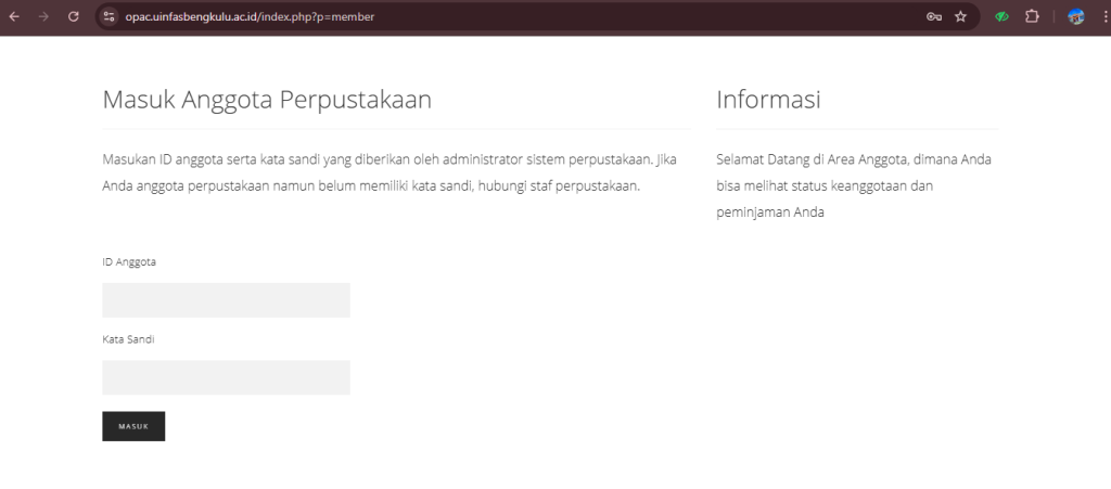 pada kolom ID Anggota masukkan NIM, dan pada Kata Sandi masukkan NIM. - Mahasiswa mengecek persyaratan pada laman https://library.uinfasbengkulu.ac.id/informasi/distribusi-karya-akhir-mahasiswa/, untuk melakukan distribusi di UPT Perpustakaan UINFAS.